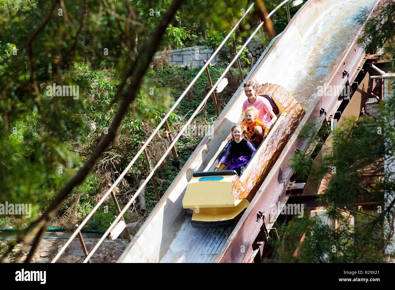 Family With Kids On Roller Coaster In Amusement Theme Park Children Riding High Speed Water Slide Attraction In Entertainment Fun Fair During Summer Stock Photo Alamy